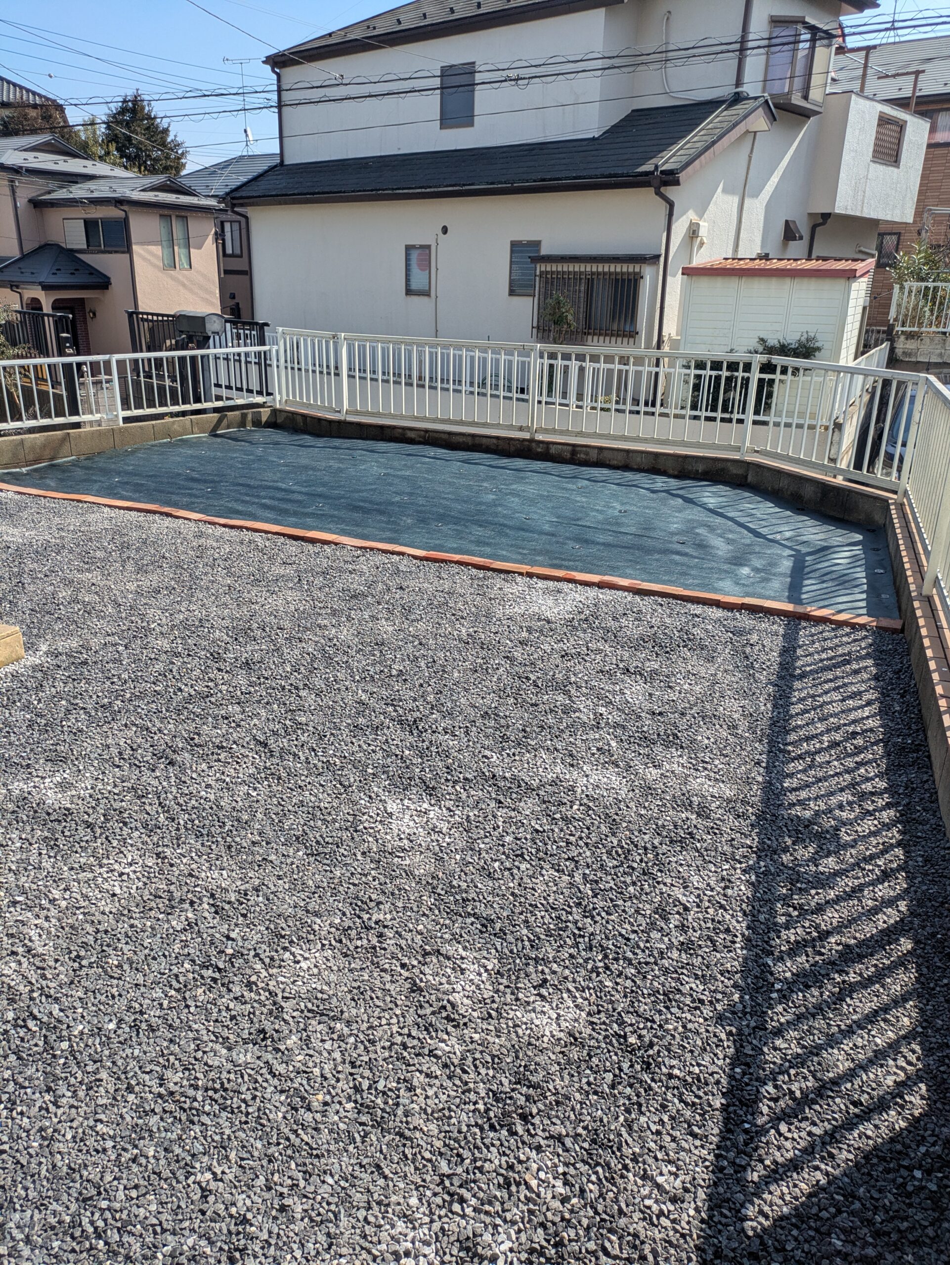 茨城県 牛久市にて伐採、伐根、砂利敷き、防草シート施工工事のご依頼を頂きました!庭に植わってあるすべての樹木を伐採、伐根し、新たに防草シート砂利敷きに仕様変更となりました。